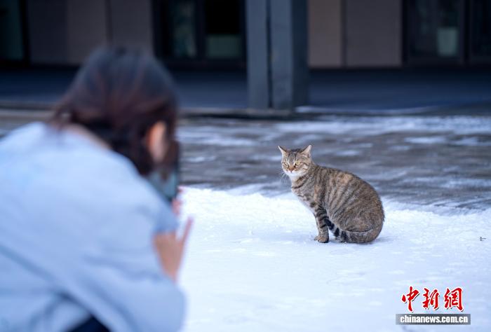12月13日,雄安新区市平易近效劳焦点内乱市平易近正正在给雪天中的小猫摄影。中新社记者 韩冰 摄